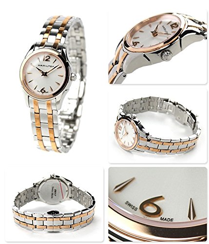 Stainless steel case with a two-tone (silver and rose gold-tone) stainless steel bracelet. Fixed rose gold-tone bezel. White dial with rose gold-tone hands and index hour markers. Arabic numerals mark the 6 and 12 o'clock positions. Swiss quartz movement. Scratch resistant mineral crystal. Textured steel crown. Solid case back. Case diameter: 27 mm. Invisible double locking clasp. Water resistant at 50 meters / 165 feet. Functions: hours, minutes. Hamilton Lady Jazzmaster White Dial Ladies Watch H32271155.Feature