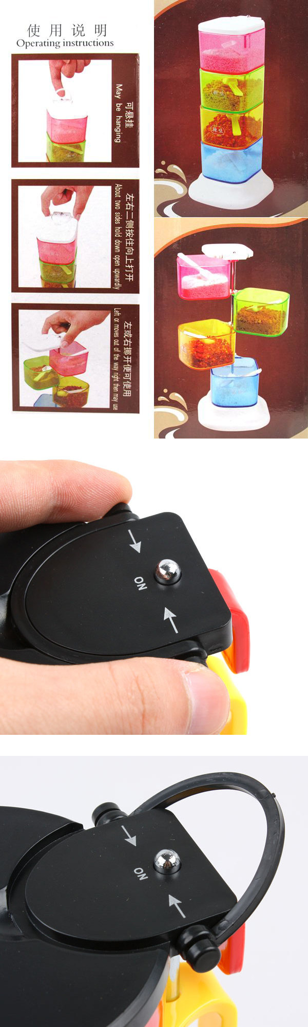 四个不同颜色的盒子,可分别装不同的调料,可旋转式设计,使用方便,不用开盖,旋转下就可,省时省力,不用时可集合在一起,不占地方,是时尚生活,家庭必备之物.也可作为活动