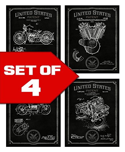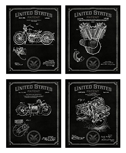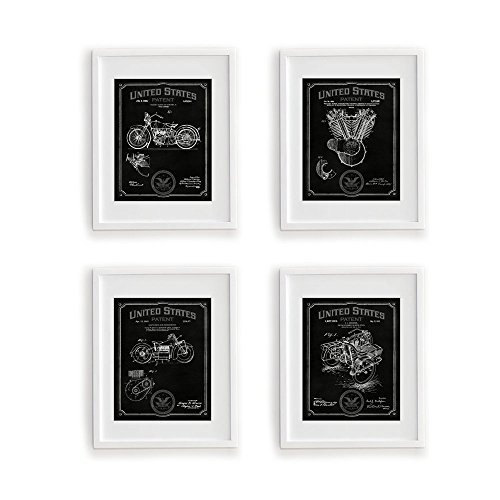 Midnight Black Motorcycle Patents Decor Set of Four 8x10 Vintage Motorcycle Themed Decorative Prints, great for bachelor pad, office, living room. Designed exclusively for Wallables.