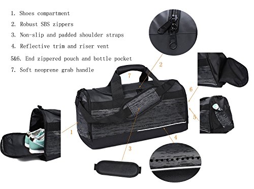 Product Description MIER Gym Duffel Bag Advantages: 1. This bag is super strong. High quality durable fabric, extra shoes compartment, padding shoulder strap,"SBS" zipper, Reflective trim on the front of bag, make it visible, riser vent both on the front and wet compartment 2. Excellent design: With the ardent fitness buff in mind, this MIER sport duffel bag special custom made. Feel confident to toss it into the back of a car or squeeze it into an overhead airplane compartment without worrying about any problem 3. Intend use:Ideal for team sports bag, fitness, trainer, weekender, occasional traveling etc 4. Quality guarantee: MIER bag must be 100% inspection before leave the factory 5. Supper service: MIER excellent customer service for you