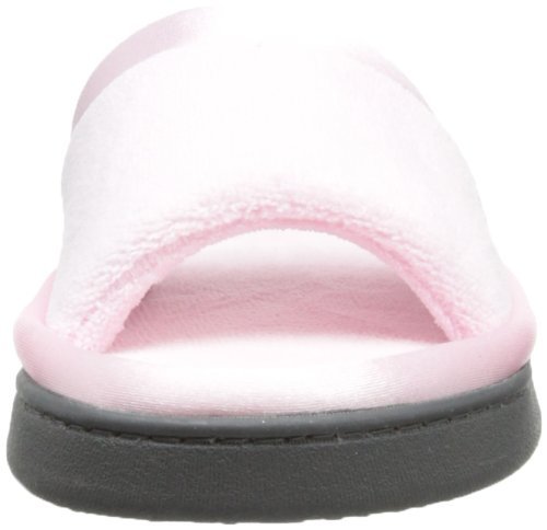 -. Feature : Slide-on terrycloth slipper with satin trim and open toe / Cushioned footbed