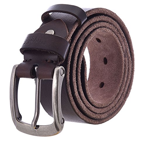 -. Feature : Top grain leather belts may have wrinkles, scars, scratches that are inherent characteristics and natural beauty of the cowhide. / 100% Genuine Cowhide Leather, no Interlayer, no artificial leather, one piece of leater. / Leather: 1.5inch wide; Buckle: 2.0inch wide, 2.36inch long( 1.0inch=2.54cm) / If your waist size is 34, please choose our size:32-34inch. If your waist size is 36, please choose our size:34-36inch. Size reference: belt size(inch)--full length(cm),30-32inch--100cm;32-34inch--105cm;34-36inch--110cm;36-38inch--115cm;38-40inch--120cm;40-42inch--125cm. Belt full length measuring from head to the tail of the belt strap. (not including the belt buckle) / Exquisite gift packaging and quality service.