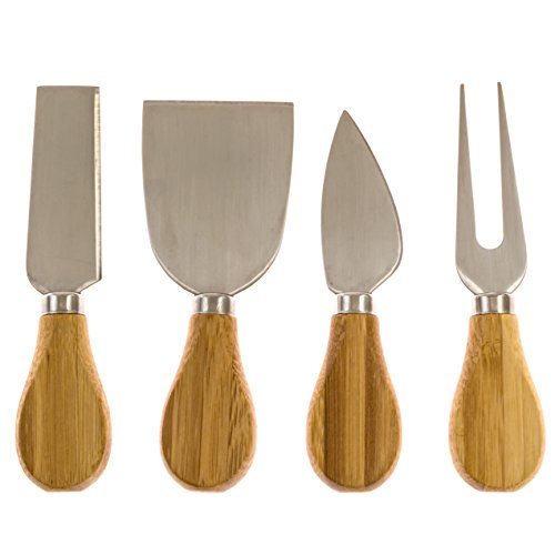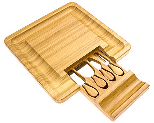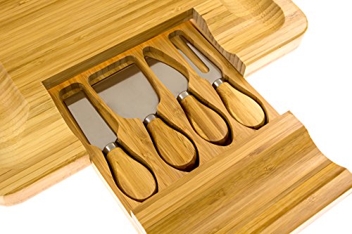 Elegent Cheese Cutting Board Square, 4-Piece Cheese Board, Cutting Board & Cutlery Set with Slide-Out Drawer Inc. Cheddar, Stilton, Hard Cheese Knive and Cheese Fork Set by Intriom Bamboo Collection