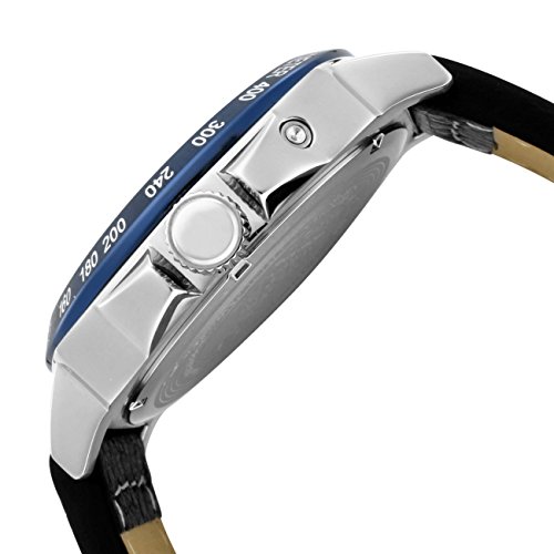 -. Feature : Swiss quartz movement / Flame-fusion crystal; brushed and polished stainless steel case; black leather strap with contrast stitching / Day and date subdials / Silver dial with black and white hands, hour markers and arabic numeral 12; luminous; blue ion-plated stainless steel tachymeter scale on bezel / Water resistant to 330 feet (100 M): suitable for snorkeling, as well as swimming, but not diving