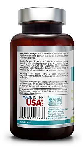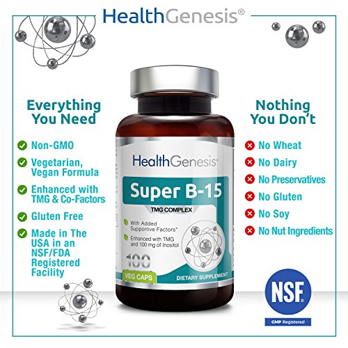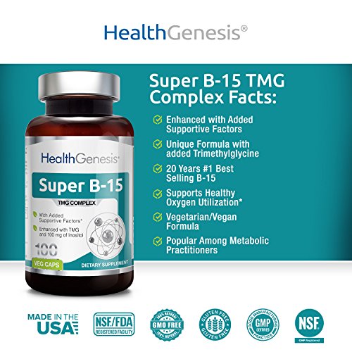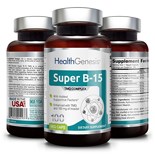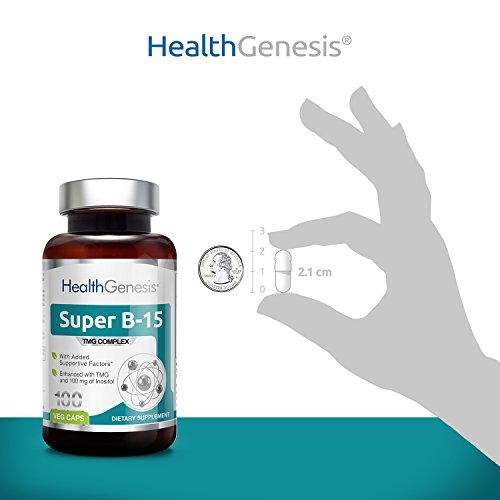 -. Binding : Health and Beauty -. Brand : Health Genesis -. EAN : 0897924002933 -. Feature : Manufactured to the Highest Quality Available / Satisfaction Ensured / Great Gift Idea -. Label : Health Genesis -. LegalDisclaimer : This information is intended for your general knowledge only and is not substitute for professional medical advice or treatment for specific medical conditions. This information is not intended to diagnose, treat, cure or prevent any disease. Always seek the advice of your qualified physician or other health care provider with any questions you may have regarding a medical condition. Keep out of reach of children. -. Manufacturer : Health Genesis -. MPN : 0897924002933 -. NumberOfItems : 1 -. PackageQuantity : 1 -. PartNumber : 0897924002933 -. ProductGroup : Health and Beauty -. ProductTypeName : HEALTH_PERSONAL_CARE -. Publisher : Health Genesis -. Studio : Health Genesis -. Title : Super B-15 Pangamic Acid Complex 100 Vcaps - TMG Trimethylglycine | Healty Oxygen Levels | Energy -. UPC : 897924002933