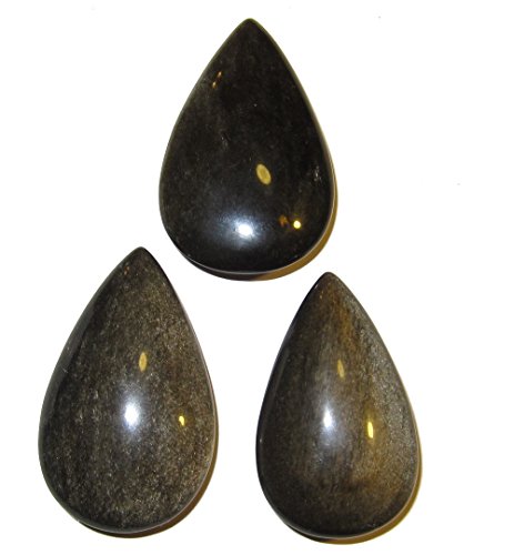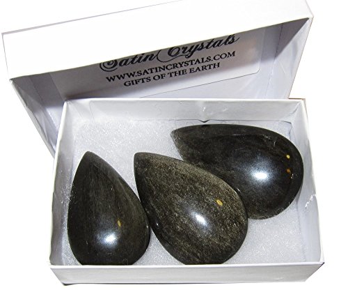 - Your polished stone set is made from high quality Gold Sheen Obsidian, hand selected by Satin Crystals. The three rounded teardrop shaped pieces are of volcanic origin, with a black color and gold sheen that may appear when caught in the correct angle of light. They are glossy and sleek, yet retain small lines and grooves characteristic of genuine gemstones. Your stone is great for layouts, carrying, rubbing to stress release, meditation, and much more. Receive the exact one featured when you order from Satin Crystals.