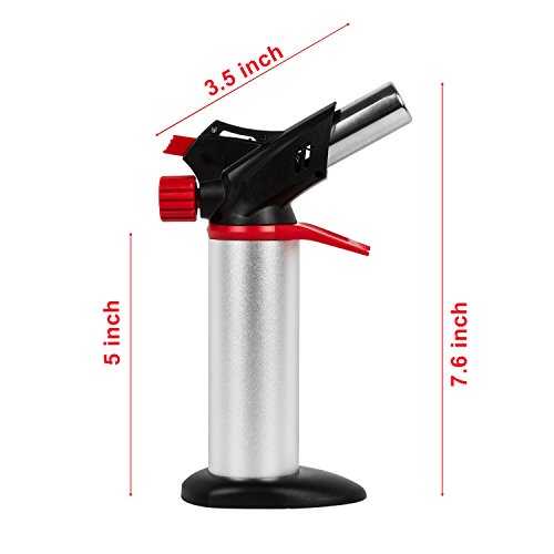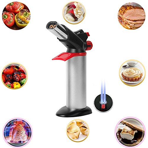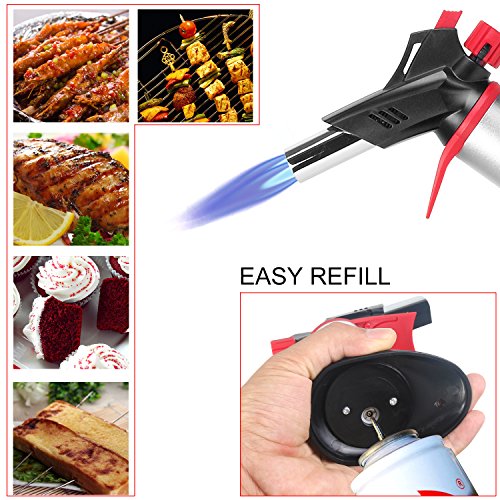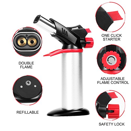 - ✔SAFE, EASY- Built in child safety lock to avoid inadvertent operation. Easily refilled, ergonomic design, comfortable to use. Once filled and switched on, you get two great and strong flames. One fancy dinner out with creme brulee as the desert would have cost twice the cost of this kitchen torch. Perfect Christmas gift idea