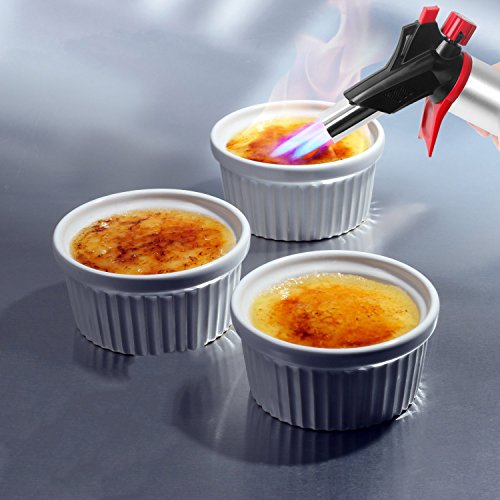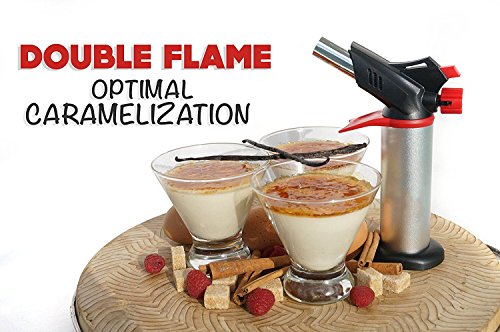 - ✔ DOUBLE FLAME - Adjustable dual flame, heats up to 1300'C / 2500'F. 2 is always better than 1. Caramelize your Creme Brulee or braze your peppers twice as fast with 2 beautiful flames. Our dual flame brulee torch creates a unique temperature pattern for optimal caramelization - this uses less fuel and is more efficient than single flame blowtorch. ★Note: BUTANE GAS NOT INCLUDED ★
