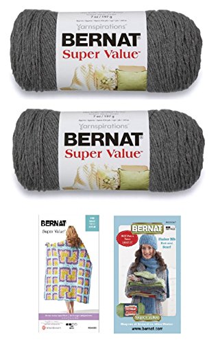 Bernat Super Value Med (4) Weight Yarn, 7 Oz True Grey (2-Pack) With 2 Bernat Patterns