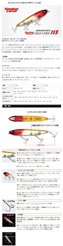 EVERGREEN/에버그린JUSTINE/쟈스 틴 115◆전장:11.5cm ◆자중:19.5g ◆타입:플로팅◆권장 태클(Tackle) Rod:미디엄 라이트~미디엄6‘0“~7’0”베이트 로드◆Line:8~14lb. ◆링(스냅)크기 【라인아이】 #2,【훅 아이】 프론트:#2센터:#2리어:#2★필드를 불문하고 잡히는 내츄럴 싸일런트 펜슬 베이트,오리지날(95mm)쟈스 틴의 컨셉은 그대로에,한층 밀어던지기 쉬움,한층 원투 성능을 플러스 한 쟈스 틴115.액션 Response와 hooking 퍼포먼스로도 뛰어난다,취급하기 쉬움과 쟁취하기 위한 기능을 추구해 진화를 이뤘다, 실전형이 잡히는 펜슬 베이트입니다.
