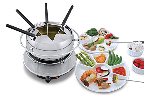Zurich delivers Design and Function, Aesthetics and Appeal. Take entertaining with family and friends to a new level. The performance, power and variable heat control of Zurich's burner plate defines multi-functionality. When not enjoying meat, cheese or chocolate fondue, use the separate burner plate as you would a stove top element. The Zurich is not just a fantastic fondue, it's so much more! The Zurich Electric 11-piece Fondue Set includes a stainless steel ringed pot, a stainless steel spatter guard, a ceramic Bain-Marie insert, 6 fondue forks, a detachable magnetic power cord and a stylishly raised electric burner rechaud base with rails.Feature