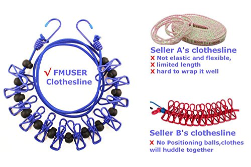 FMUSER 6ft Portable Elastic Clothesline for Travel, Adjustable Windproof Clothline with Clothespins and Stoppers, Laundry Hanging Rope for Camping, Hiking, Outdoor, Indoor Use, 1 year Free Return