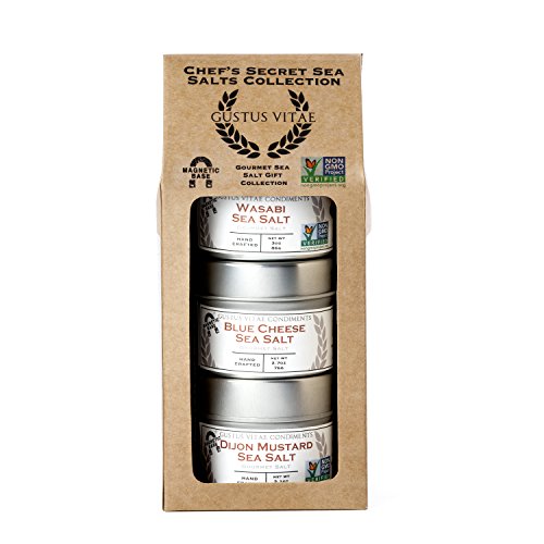 -. Binding : Misc. -. Brand : Gustus Vitae -. EAN : 0858407005360 -. Feature : Gourmet Sea Salt Gift Pack | Non GMO Certified / Small Batch | Hand Crafted / Unique Magnetic Tins Stick to Most Fridges, BBQ's, Ovens, Hoods, Metal Surfaces / No Artificial Flavors | No Artificial Colors | No MSG | No Fillers / Sustainably Sourced Ingredients | All Natural -. IsAdultProduct : 0 -. Label : Gustus Vitae -. Manufacturer : Gustus Vitae -. PackageQuantity : 1 -. ProductGroup : Grocery -. ProductTypeName : GROCERY -. Publisher : Gustus Vitae -. Studio : Gustus Vitae -. Title : Chef's Secret Sea Salts Collection - Non GMO - 3 Magnetic Tins - Small Batch Artisan Salts -. UPC : 858407005360