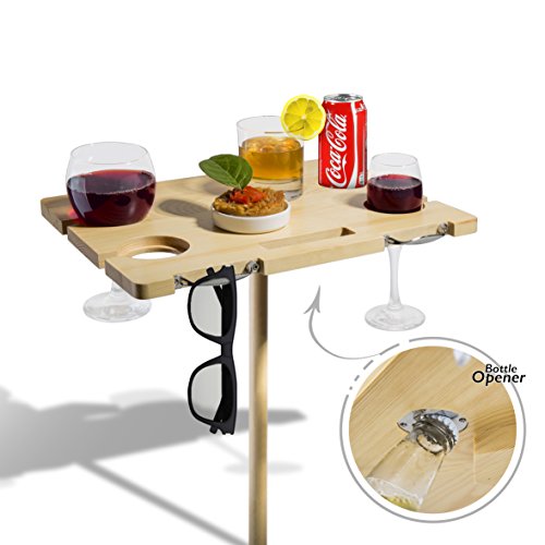 WINE TABLE IS EASILY ASSEMBLED BY SCREWING THE LEG INTO BACK OF TABLE. leg easily holds up in all sand or soil surfaces. Table cutouts holds your stemmed wine glass and soda/beer cans. Table can hold wines, drinks cheese and snacks. Beer opener and sun-glass holder are additional special features.