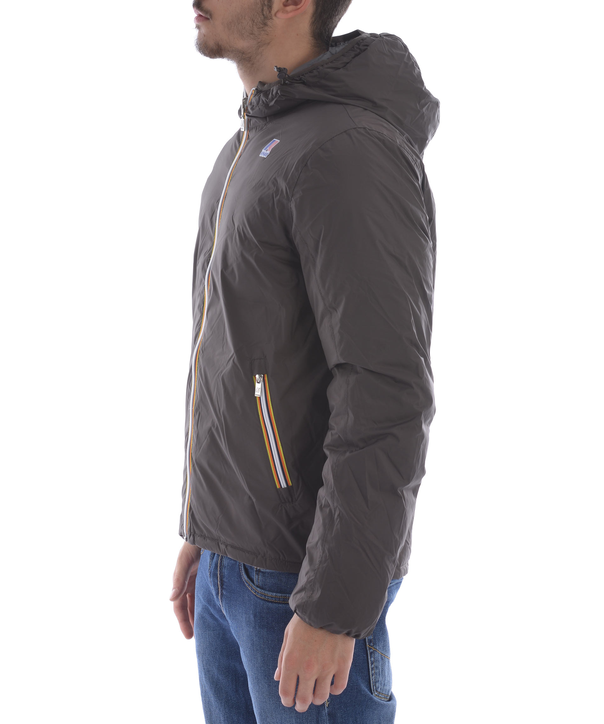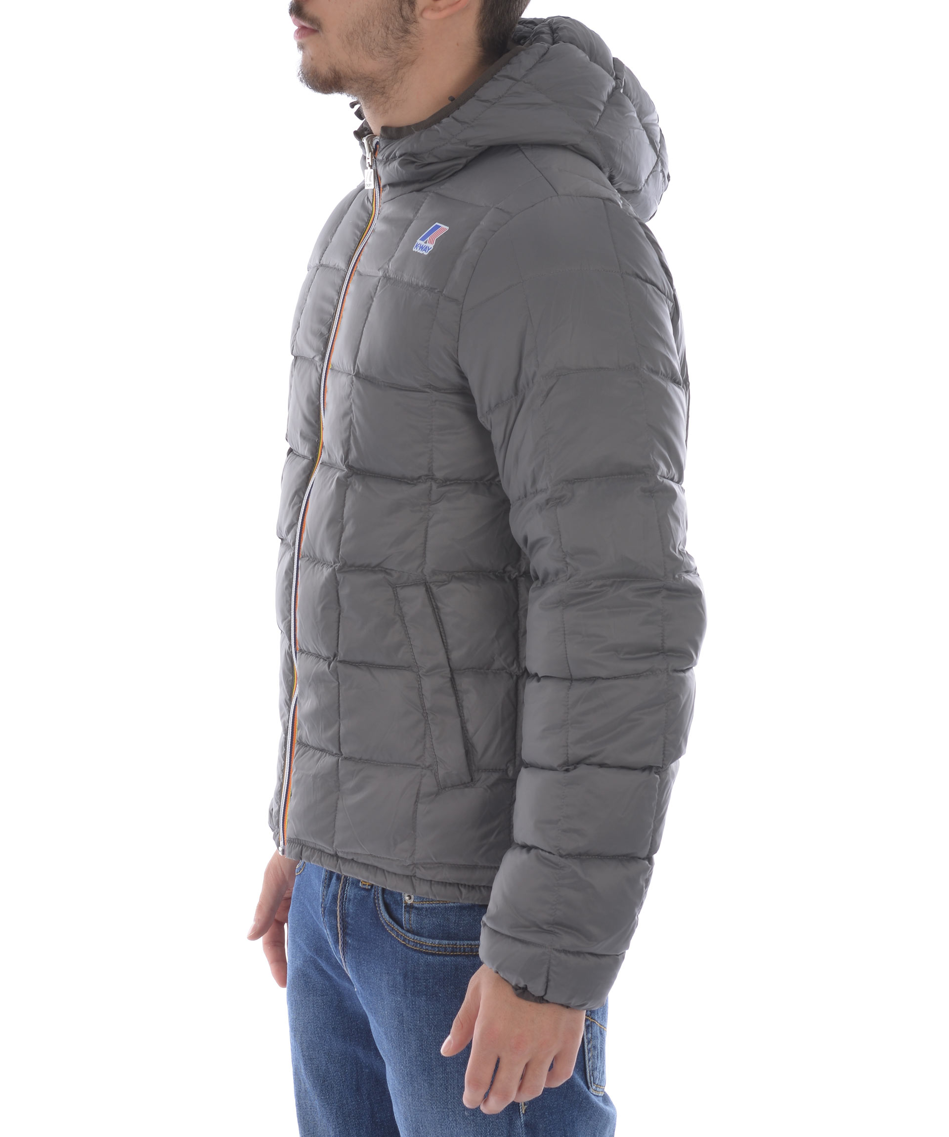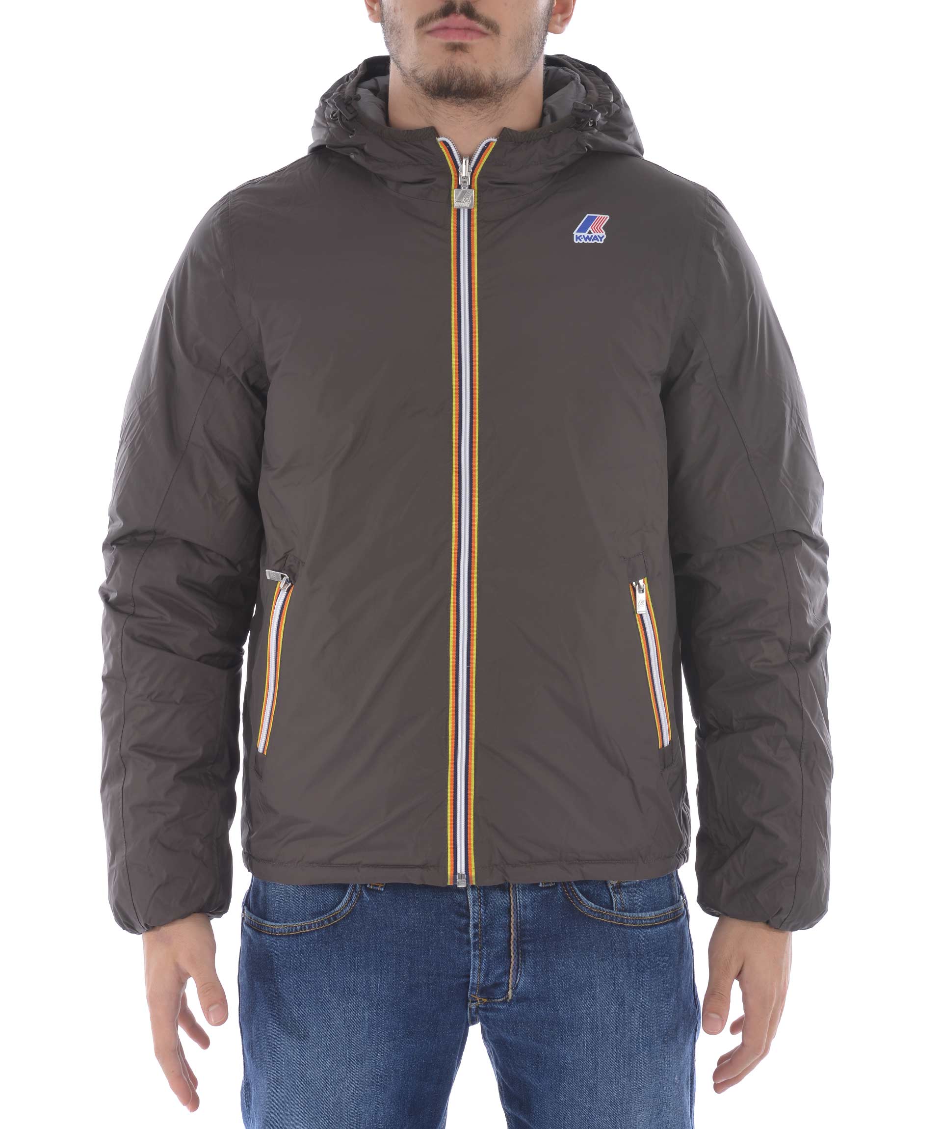 Piumino K-Way in nylon double face. Un lato Grigio scuro trapuntato, lato opposto Marrone non trapuntato. Imbottito con piume d'oca. Cappuccio fisso con coulisse. Chiusura frontale con zip. Tasche frontali con bottone a pressione sul lato grigio scuro, e con zip sul lato marrone. Polsini elasticizzati. Logo stampato sul petto.