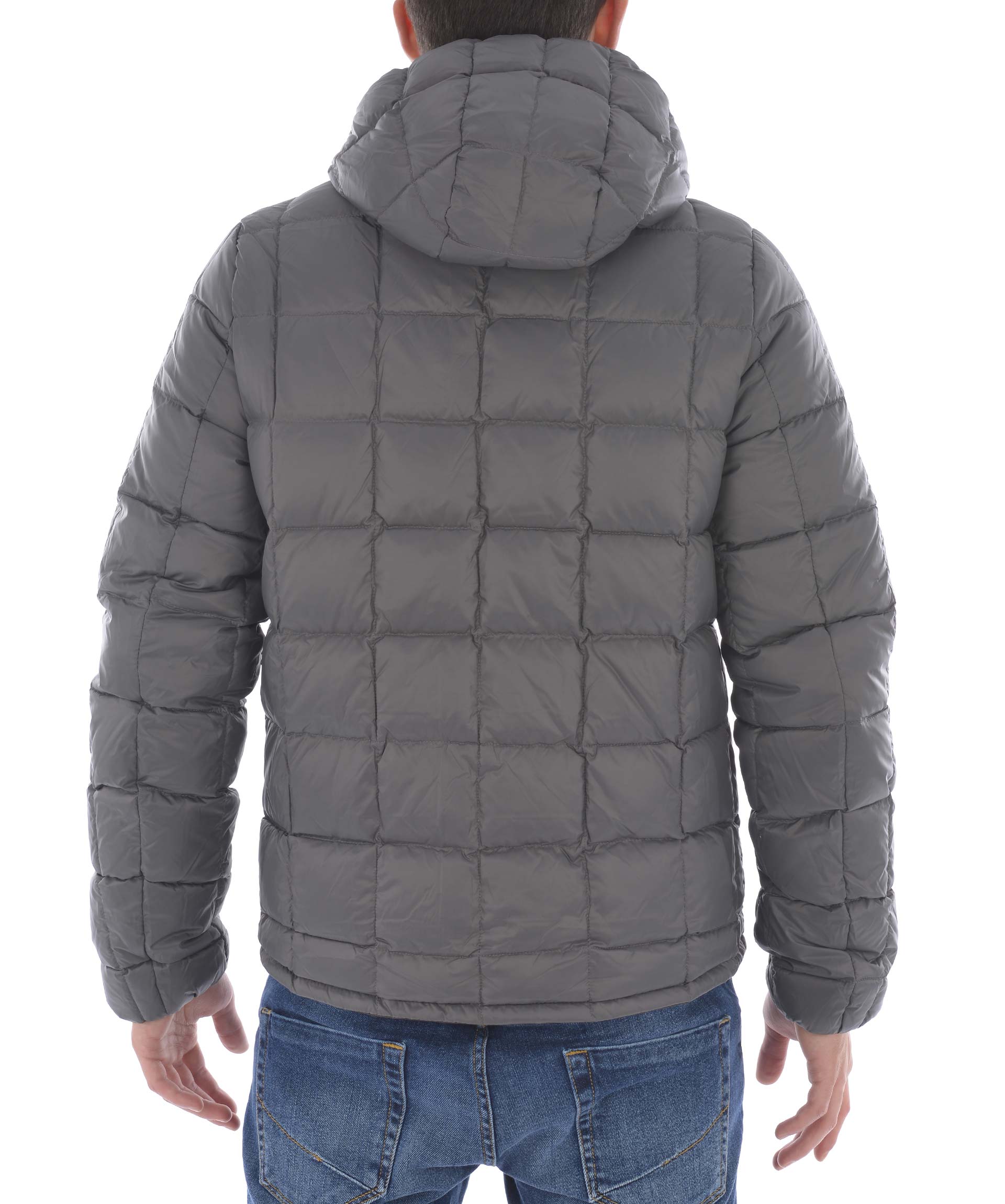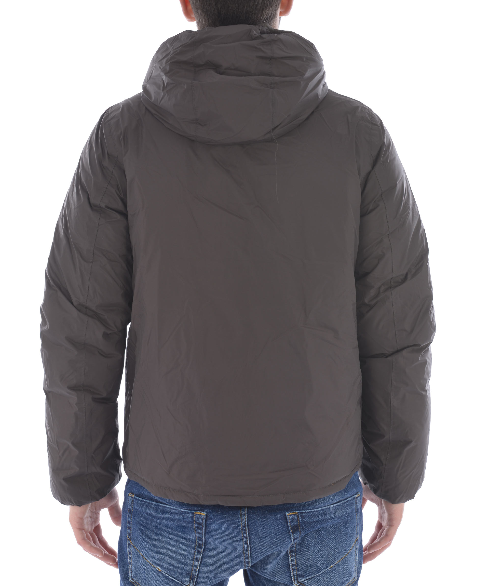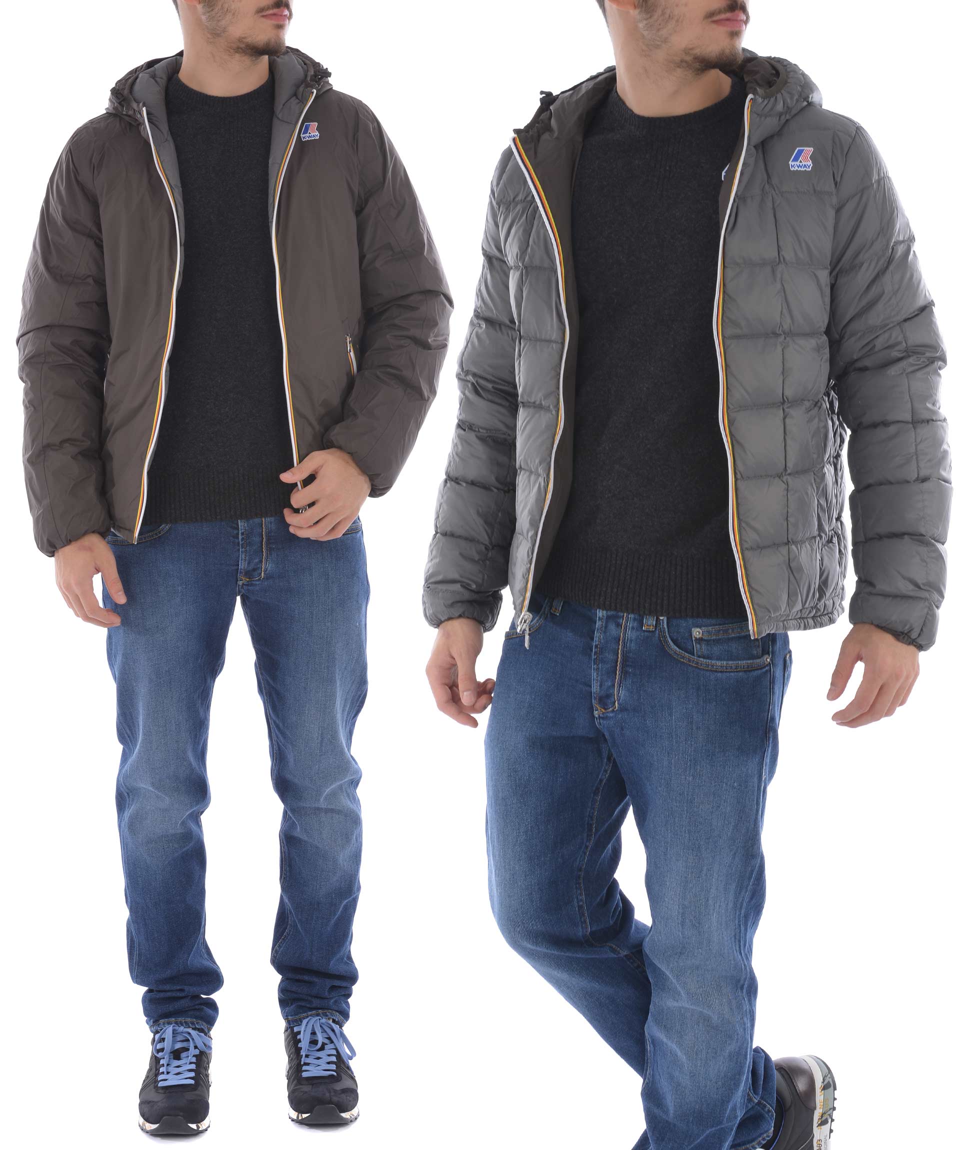 Piumino K-Way in nylon double face. Un lato Grigio scuro trapuntato, lato opposto Marrone non trapuntato. Imbottito con piume d'oca. Cappuccio fisso con coulisse. Chiusura frontale con zip. Tasche frontali con bottone a pressione sul lato grigio scuro, e con zip sul lato marrone. Polsini elasticizzati. Logo stampato sul petto.