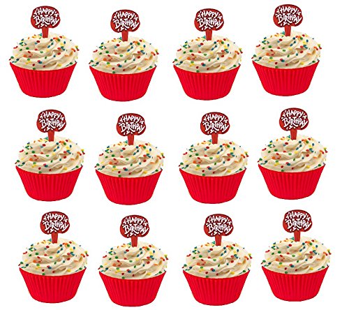 24pk Happy Birthday Cupcake Decoration Topper Picks with Baking Cups (Red)