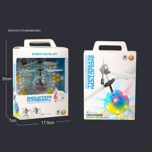 OUBAO RC Toy EpochAir RC Flying Ball, RC Drone Helicopter Ball Built-in Disco Music With Shinning LED Lighting for Kids Teenagers Flyings for Kids Toy It is motion-sensitive so it detects nearby objects and is programmed moves away from them. The idea is that you launch it and then hold your hand underneath it to keep it in the air. It continuously detects your hand and moves away from it.? The ball contains the battery and motor and also some flashing LED lights. When you turn it on the lights flash brightly. It has great visual appeal for any child. It looks fantastic at night in a darkened room. It is also very therapeutic if you are stressed out after a hard day; especially at night when the lights show up brightly. Product Description: - A key to open,simple operation,easy to play.