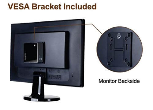 -. Feature : Note: This is a barebones PC with the capacity for 8GB RAM and 1TB HDD. However, RAM and Hard Drive are NOT included. / Processor: Intel Celeron N2807 processor (1.58Ghz Clock Speed, 2.16Ghz Max Turbo) / Storage: Support 2.5" SATA Hard Drive / Slots: 1 x Mini PCIe Slot (Half Size, Occupied by the WiFi and Bluetooth Card) / Ports: 1 x USB 3.0 Port (front); 2 x USB 2.0 Ports (rear); 1 x VGA Port, 1 x HDMI Port, 1 x RJ45 LAN Port, 1 x Audio Out/Mic In / Features 22nm Intel Celeron N2807 to deliver to the most intuitive and integrated operating systems in the world / Supports 2.5-Inch thickness 7.0/9.5mm Hard Drives (1 x 3Gbps SATA2) / Ultra compact PC design - 0.69L(56.1x 107.6 x 114.4mm) / 1x SO-DIMM DDR3L 1.35V Slots (1333 MHz),Preinstall IEEE 802.11 b/g/n Wi-Fi / Bluetooth 4.0 Mini-PCIe card / Supports dual displays via a VGA and a HDMI port,Gigabit LAN / Audio jack (Headphone/MIC),VESA mounting bracket (75 x 75mm + 100 x 100mm)