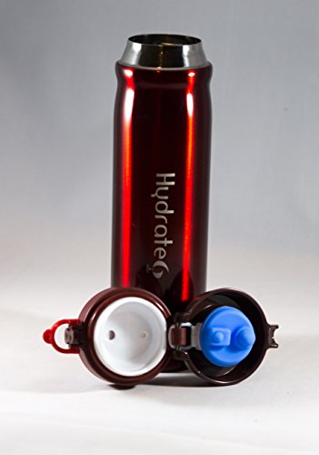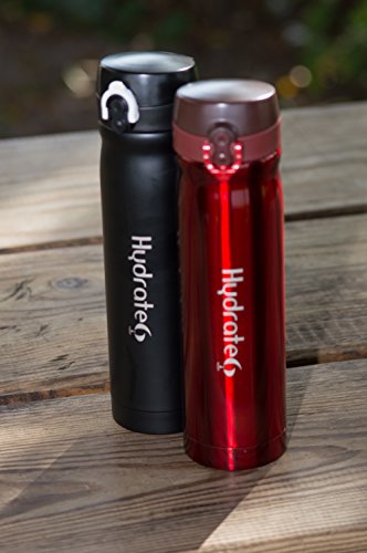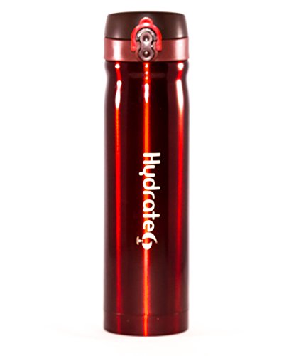 Hydrate6 double wall insulated stainless steel bottle, has a very sleek design that fits into any environment, whether in your office, car, gym bag, backpack or handbag while you're on the go. Beverages and water, whether hot or cold will maintain a consistent taste since this bottle's BPA free stainless steel inner walls is resistant to corrosion resulting in rusts and stains. It's uniquely designed cover with a one touch button opener has an extra secure lock, preventing accidental spillage. So, if you decide to transport coffee, juices, tea, water or beverages, this is the ultimate bottle.Feature