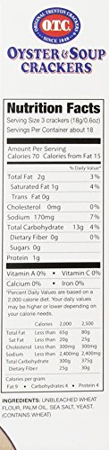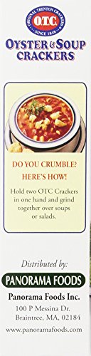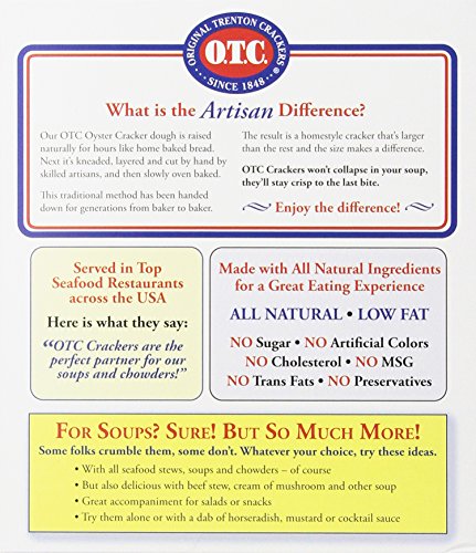 -. Binding : Grocery -. Brand : OTC -. EAN : 0070651000087 -. Feature : OTC Crackers will not collapse in your soup, stays crispy to the last bite; Great for soups and salads; Artisan Style Cracker / All natural; Zero Trans Fats / Homestyle cracker that's larger than the rest and the size makes the difference / United States of America -. Label : OTC -. Manufacturer : OTC -. Model : 015604 -. MPN : 00121010 -. NumberOfItems : 12 -. PackageQuantity : 12 -. PartNumber : 00121010 -. ProductGroup : Grocery -. ProductTypeName : GROCERY -. Publisher : OTC -. ReleaseDate : 2006-08-03 -. Studio : OTC -. Title : O.T.C. Oyster & Soup Crackers, 10-Ounce Boxes (Pack of 12) -. UPC : 070651000087