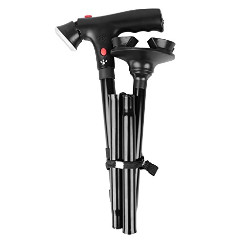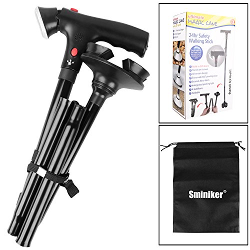 Studio : Sminiker Publisher : Sminiker Binding : Health and Beauty Product Description Sminiker LED Safety Folding Walking Cane The sminiker LED Safety Folding Walking cane fully-equipped,an extra-wide, pivoting head designed for perfect balance on most surfaces, including gravel, sand and snow.Take those stairs with ease and never let uneven terrain get between you and doing what you love. Now you can walk up and down those challenging hills confidently. One big feature is that it is equipped with safety alarm, enable you to call for help in emergency case when having outdoor activities like hiking and camping. The cane even stands by itself when left unattended. The folding design makes it convenient for travel, while the built-in LED lights safely guide you in the dark. Includes foldaway strap.