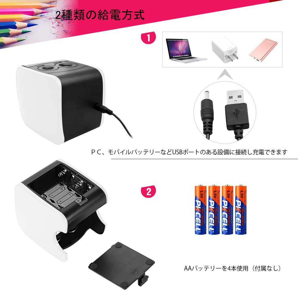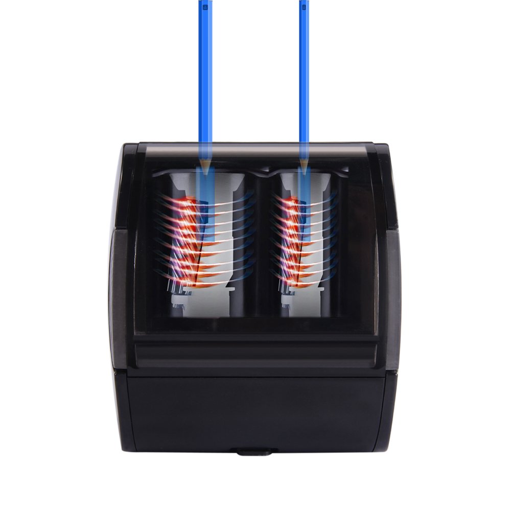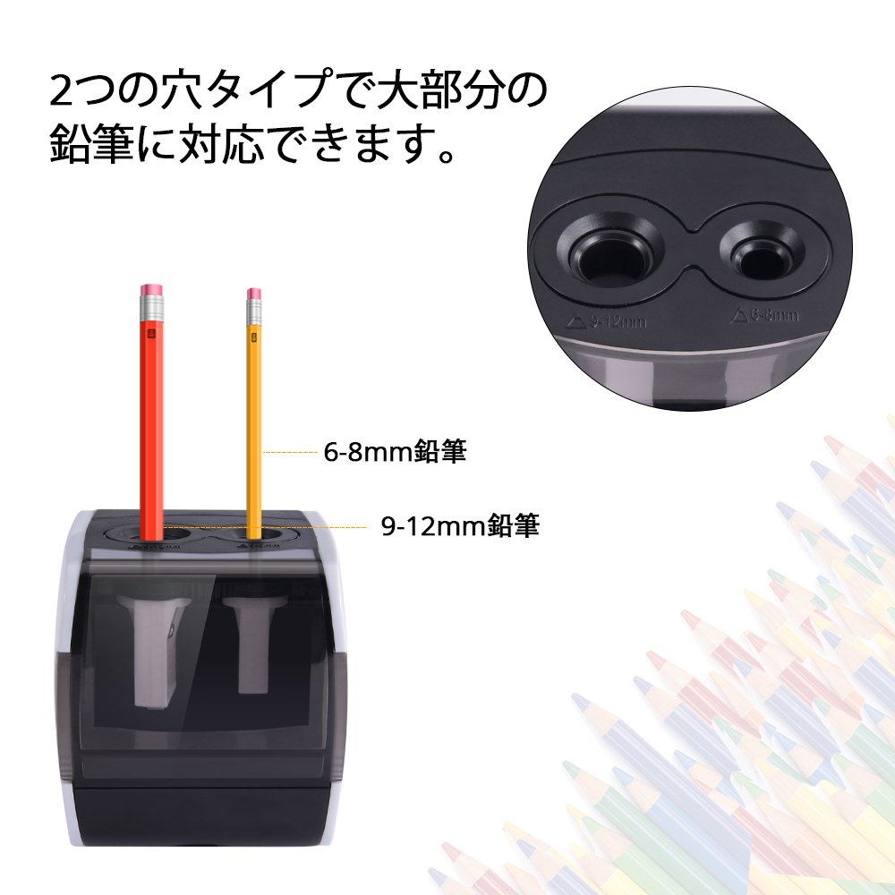 There are two cutting holes, each corresponding to a pencil with a diameter of 6 - 8 mm and 9 - 12 mm.