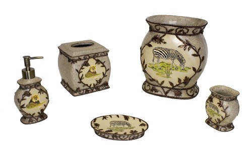 -. Feature : Complete the look of your bathroom with this five-piece bath accessory set from Sherry Kline / The bath accessory set is made of Resin with an Animal Safari look, hand-painted P.R.Int embossed gold colored trim and the sides feature an earth tone look. / Five-piece collection includes: One (1) soap dish, One (1) lotion dispenser, One (1) wastebasket, one (1) tumbler, and One(1) Tissue Holder