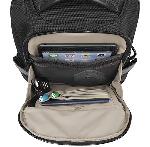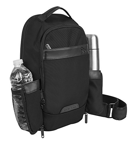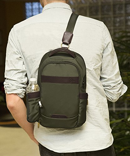 -. Feature : Two roomy compartments, sling strap is right-shoulder, left-shoulder reversible / Front compartment has organizer with RFID blocking card and passport slots, pen slot and 2 wall pockets - 1 zippered mesh and 1 drop in pocket which holds an iPad mini / The rear compartment has a padded and fleeced lined pocket for an iPad or tablet and plenty of room for other items / Front and rear zip slash pockets for quick grab items, tethered key clip with led light, zippered mesh expansion pocket holds water bottle, sunglasses or umbrella / 9.5 x 15.5 x 3