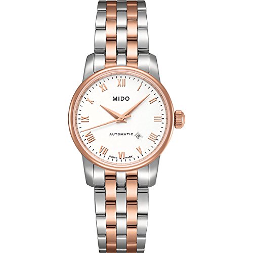 Stainless steel case with a two-tone (silver and rose gold PVD) stainless steel bracelet. Fixed rose gold PVD bezel. White dial with rose gold-tone hands and Roman numeral hour markers. Minute markers around the outer rim. Dial Type: Analog. Date display between 4 and 5 o'clock position. Automatic movement. Eta 2671 engine. Scratch resistant sapphire crystal. Pull / push crown. Case diameter: 29 mm. Case thickness: 8.65 mm. Round case shape. Band width: 15 mm. Deployment clasp. Water resistant at 50 meters / 165 feet. Functions: date, hour, minute, second. Dress watch style. Watch label: Swiss Made. Mido Baroncelli Automatic White Dial Two-tone Ladies Watch M76009N61.