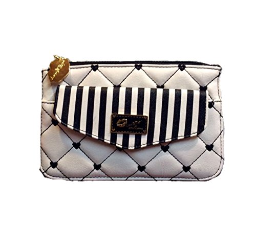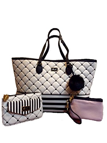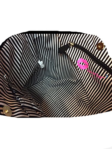 - TOTE DETAILS: Polished Gold-Tone Hardware, Golden kiss hardware zip pull, Betsey Johnson signature centered emblem, Top snap secure closure, Bottom stripe design.