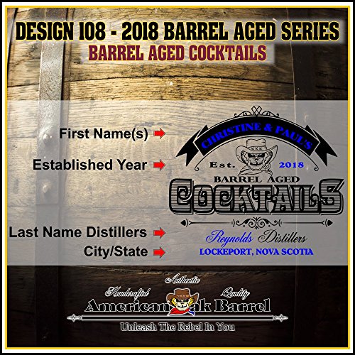 Studio : American Oak Barrel Publisher : American Oak Barrel Product Description New 2018 Designs!!! Personalized American Oak Aging Barrel - Design 108: Barrel Aged Cocktails - 2018 Barrel Aged Series............This vessel is handcrafted from American white oak, bound by 6 hoops of steel and features a stunning laser engraved design! The barrel features a medium toast char. That char is the sugar from the oak released during the firing process. As it cools, the sugar caramelizes on the inner walls and mellows the decanted spirit. The longer your spirits age in this barrel the smoother, refined or mature it becomes. Easily accommodates 2 fifths of spirit. Please enjoy responibly! 0