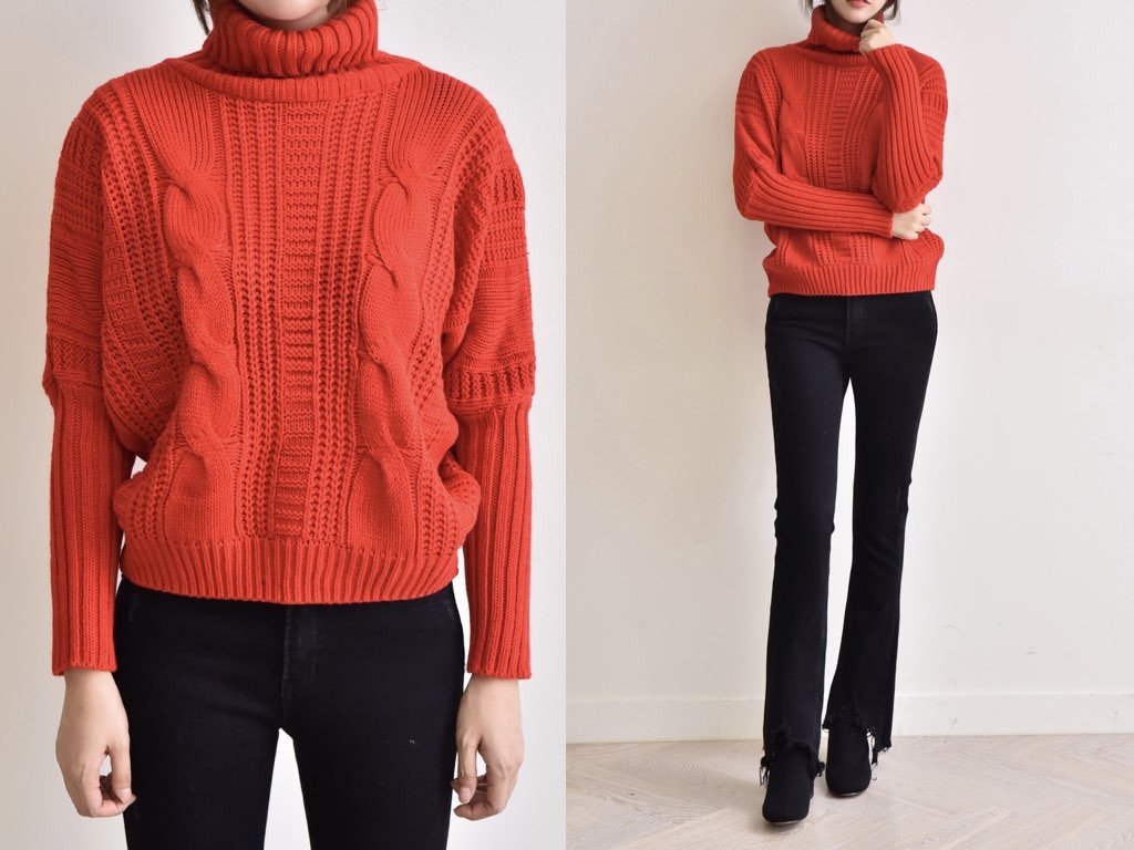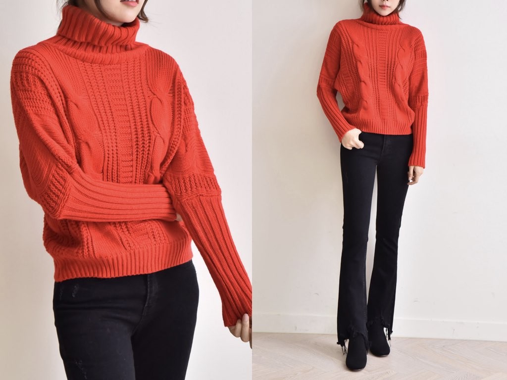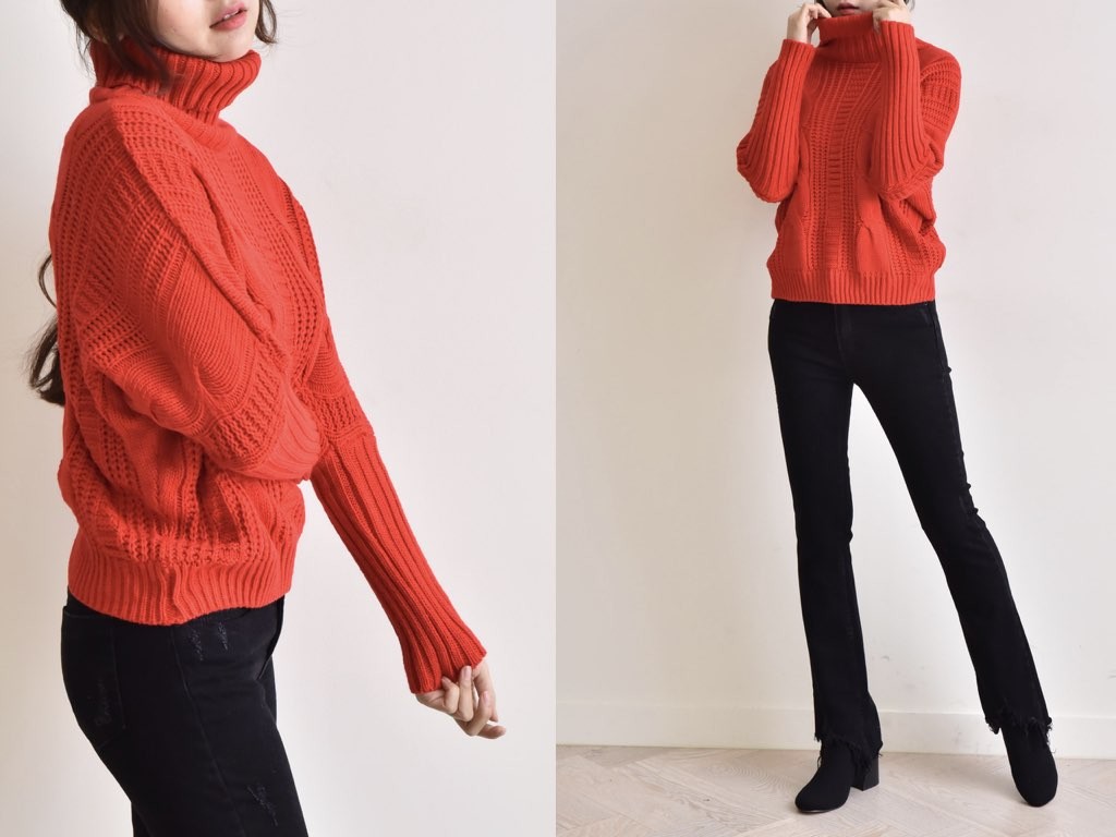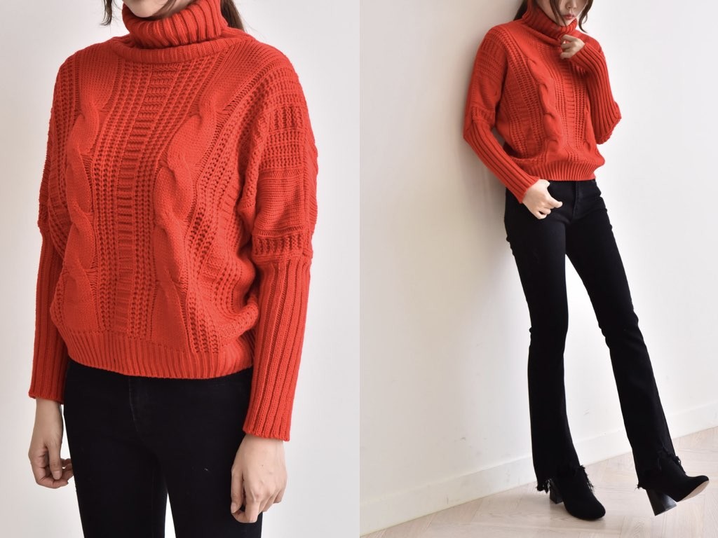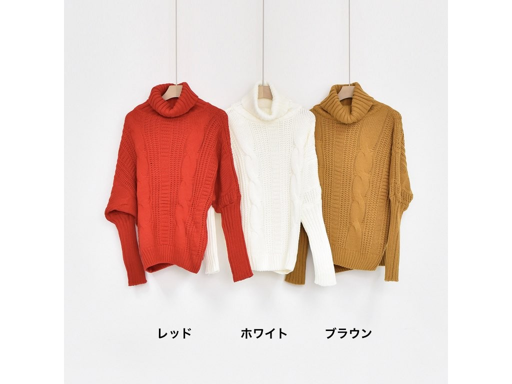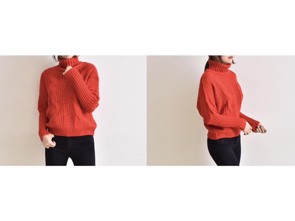 定番タートルネックニットです。ざっくり編み込まれた厚手となっています。寒くなりだすと、首元があったかなタータルトップスが恋しくなりますね。人気でオシャレな編み上げニットで、ナチュラル感を演出できます。1.基本情報色:3色展開(レッド/ホワイト/ブラウン)サイズ:Free素材:アクリル製造国:korea2.サイズ情報肩幅:ナグランデザイン身幅(胸断面):55cm腕の長さ:59cm着丈(前):55cm(サイズは計る方法に応じて±2〜3cmの誤差があります。ご了承お願い致します)モデル着用サイズ:F※着用モデル(163cm、体重47kg、足のサイズ24.5cm)3.その他の情報厚み:中間透け感:なし伸縮性:中間裏地:なし洗濯方法:ドライ(クリーニング)[注意事項]お取り寄せ商品は、海外より仕入れるため納品まで約10日前後いただきます。また店舗でも販売しており、在庫切れになる場合もございます。ご了承お願い致します。