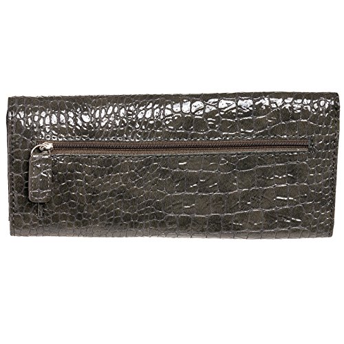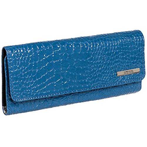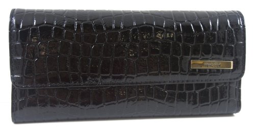 This Tri Me A River clutch wallet by Kenneth Cole Reaction features two full sized bill compartments, eight card slots, two thumb glide ID holders, and a removable kiss-lock coin purse that resides in its own slip pocket. The wallet is fully lined and designed with hidden magnetic closures. The hi-gloss crocodile embossing adds an extra touch of fashion to this classic tri fold wallet. Measures 9" x 4.25" x 0.6".