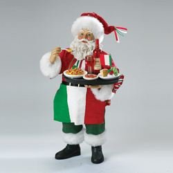It's time to celebrate and feast this Christmas season with this 10.5" Musical Fabriche Italian Santa! Perfect for your holiday decor, Santa Claus is featured here in his classic red suit and hat but with green pants and wears an apron in the Italian flag's colors over his pants. He holds a big tray of wine, cheese and pasta and plays the tune "Funiculi Funucula".Feature