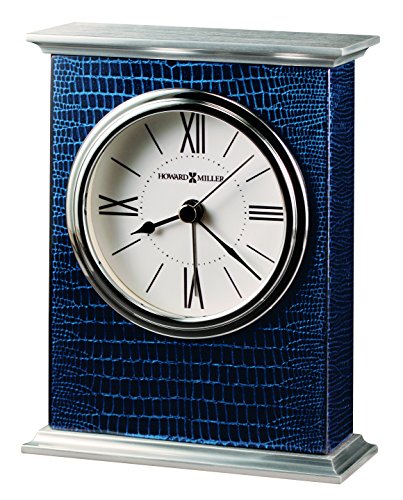 The bracket-style Mission tabletop alarm clock features a unique, iridescent, cobalt blue, reptile pattern under a striking high-gloss piano finish. The contemporary Roman numeral dial features black and silver hands and is surrounded by a polished nickel finished, waterfall-style bezel. The top and base feature a nickel finish. Quartz alarm movement includes one AA sized battery. Measures 5-1/2-inch height by 4-1/4-inch width by 1-1/2-inch depth.Feature