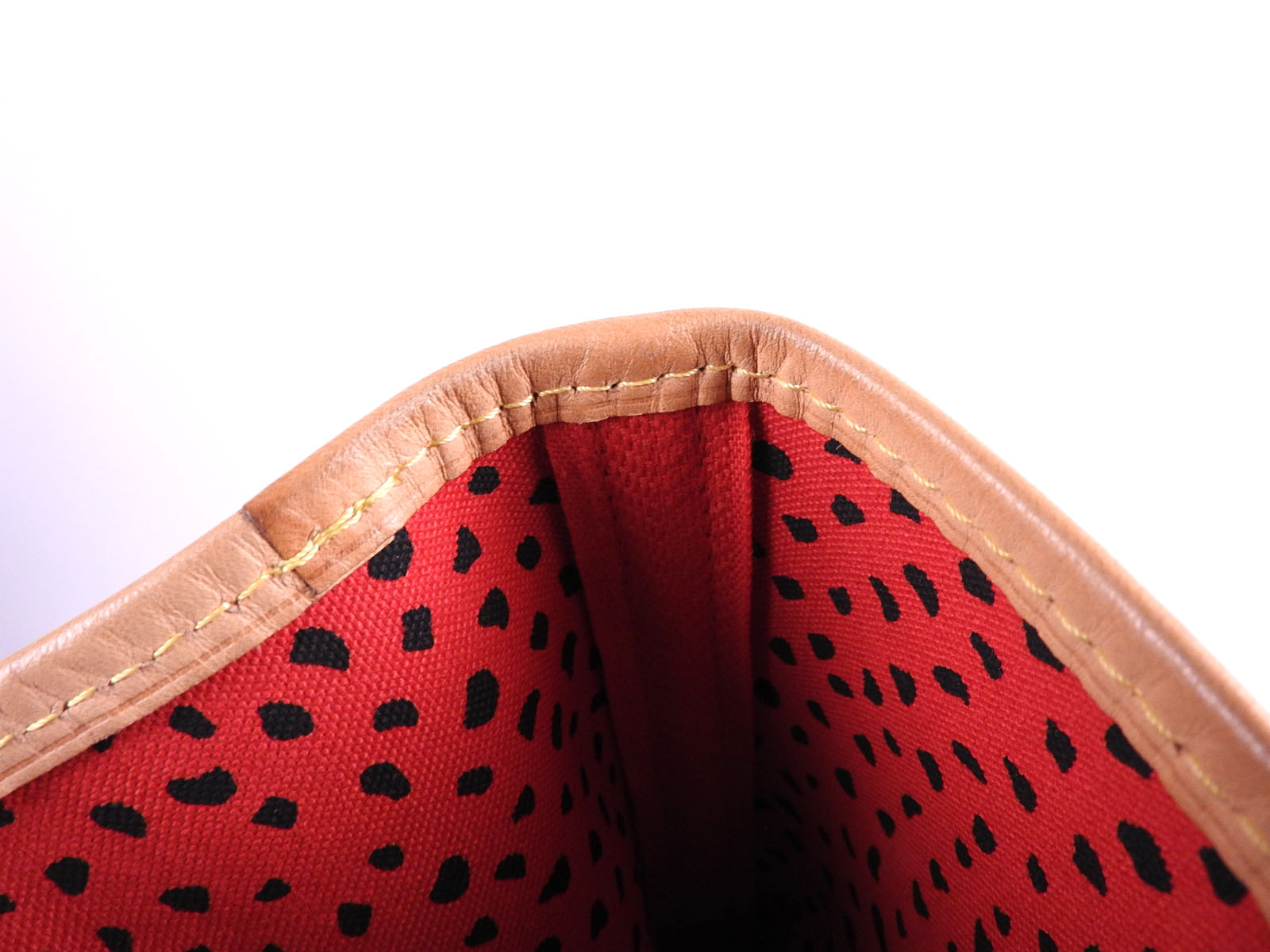 Monogram wave canvas: Barely used feeling. Good condition. Leather: Slightly used feeling. A few slight scratches. Small stains. Slight wrinkles and tanning in the trim around the top of the bag. |