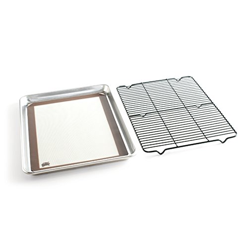 Professional pastry chefs and bakeries bake on aluminum sheets for consistently perfect results. You can do the same, with our commercial quality Naturals Bakeware Collection. Made of pure aluminum, these premium pans produce evenly browned baked goods every time. Rims are reinforced with galvanized steel to prevent warping and aluminum will never rust. Our 3-piece cookie baking set is a cookie baker's dream combo. Set includes Naturals Half Sheet, a woven fabric Deluxe Silicone nonstick mat and a nonstick metal large cooling rack. All sized to fit together. BPA and Melamine free. Oven safe up to 400 degrees.Feature