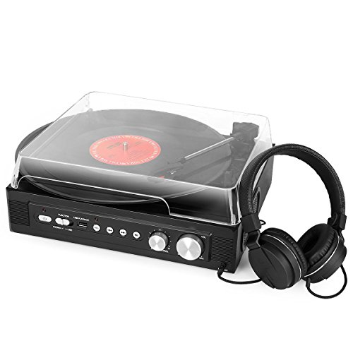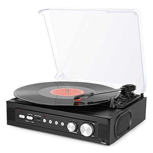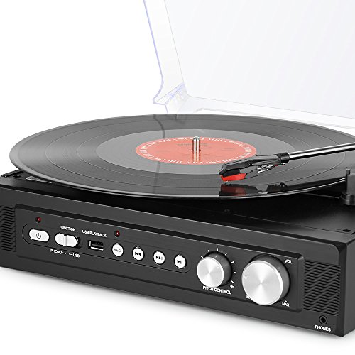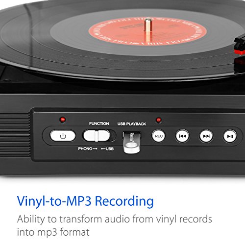 1byone Belt-Drive 3-Speed Mini Stereo Turntable with Built in Speakers, Supports Vinyl to MP3 Recording, USB MP3 Playback, Stereo Headphone Jack, Pitch Control and RCA Output, Black