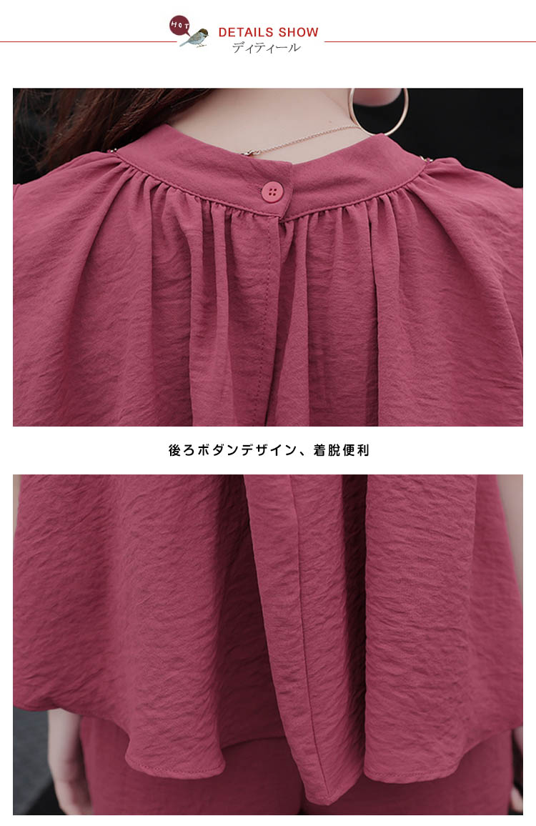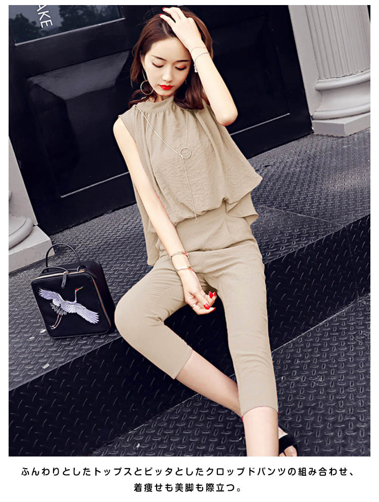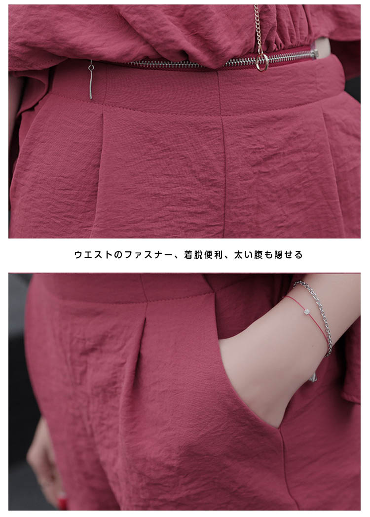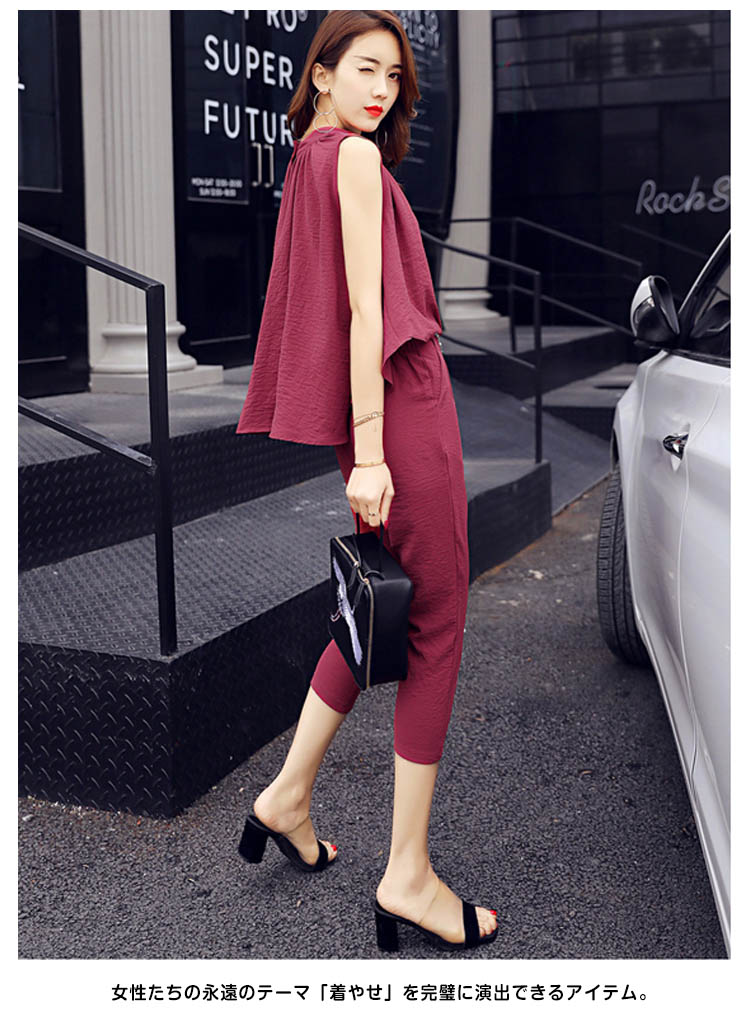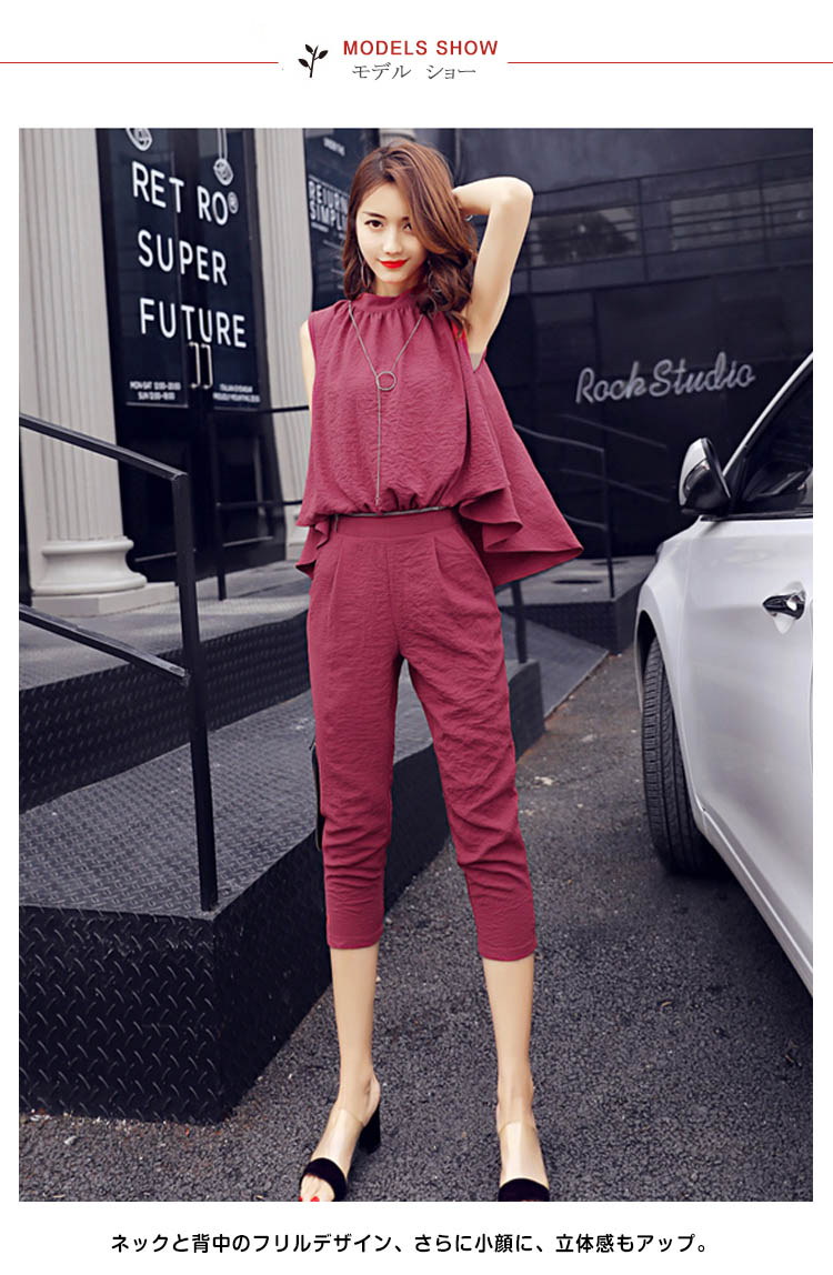 | コーデの面倒を省ける便利のオールインワン。ネックと背中のフリルデザイン、さらに小顔に、立体感もアップ。ふんわりとしたトップスとピッタとしたクロップドパンツの組み合わせ、着痩せも美脚も際立つ。女性たちの永遠のテーマ「着やせ」を完璧に演出できるアイテム。 | |