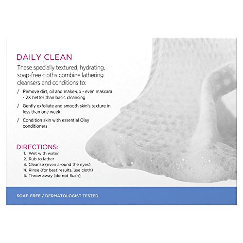 Refresh your skin with the power of Olay Daily Clean 4-in-1 Water Activated Cloths. Perfect for normal skin types, these specially textured cloths have the cleansing power of a scrub, toner, mask and cleanser to gently exfoliate skin. Use daily to remove dirt, oil and makeup—even mascara—2x better than basic cleansing. These convenient face wipes combine a soap-free lather and effective Olay conditioners to leave your skin clean, hydrated and smooth in less than one week. For on-the-go, travel or daily cleansing, pamper your skin with Olay Water Activated Cleansing Cloths.Feature