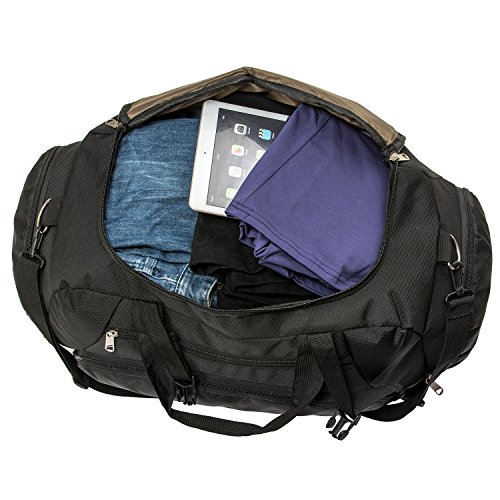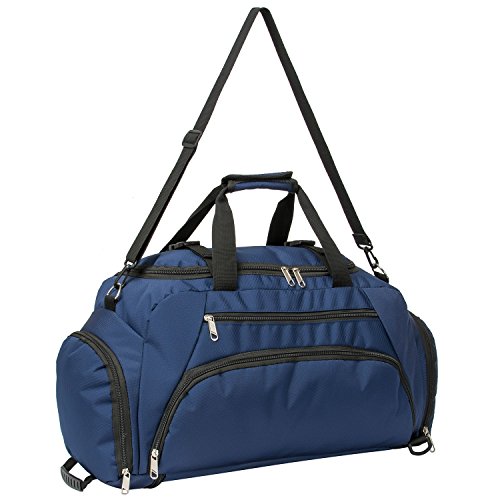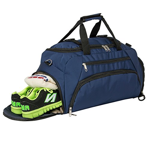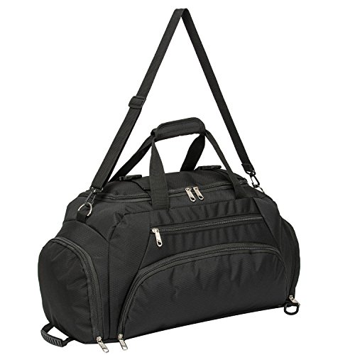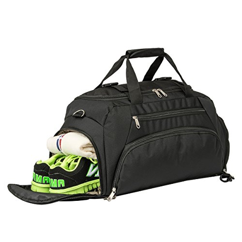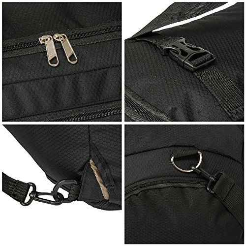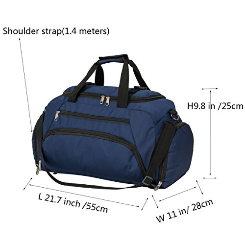 -. Feature : Awesome Duffel Bag for outdoor sports, working, traveling, hiking, camping, school and everyday using. / Size info: L 21.7*W11.0*H9.8 inch (55 x 28 x 25 cm) ;Weight:0.7kg. / Structure: With 40L Capacity. One huge compartment (with a mesh zipper pocket inside) with a 2-way zipper's C-shaped opening for clothes, shoes, basketball, umbrellas and other daily necessities;Upgraded 2 sides Shoes Compartments ventilated to keep your shoes and dirty gear separate. The front zipped pocket can hold your ipad/kindle.The main compartment with a mesh zipper pocket inside make it more convenience. / Multipurpose:This bag can used as duffle/handbag/shoulder bag/backpack when travelling.Come with a detachable shoulder strap(1.4 meters) can easily turn the backpack into a crossbody bag/shoulder bag;Two durable invisible shoulder straps can make this bag a backpack/rucksack.One bag offers at least Three different ways of carrying. / Occasion:With a Classic, Stylish & Elegant look, it is always fitting the event. Suitable for both Man and Woman