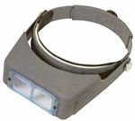 | The OptiVISOR magnifier features replaceable binocular lenses that have beveled edges that are mounted in an interchangeable plastic frame. An adjustable headband with padded leather comfort band conforms to a variety of head sizes and provides comfort for hours of continuous use. It can be worn over prescription or safety eyeglasses. A durable, plastic visor tips up above the forehead when not in use. Spring-loaded pivot screws hold the headband in a raised or a forward-facing position. The magnifier weighs 0.67 lbs., and comes housed in a protective shell and carrying case. It has a one-year limited warranty. Diopter (D) is a technical term for the measurement of the light curvature and thickness of a lens. A dioptric number and a magnification number are not the same thing. Diopter strength represents a specific magnification power (X). For example, a 5-diopter provides 2.5X magnification (at a distance of 8”). See the magnification chart. The higher the diopter, the more magnification a lens can provide. As magnification increases, distance to the object (focal length), and field of view (diameter, or narrowness of view) decreases. Magnifiers and prescription eyeglasses have a diopter value, such as 1.5 or 2. The dioptric strength of an accessory lens, such as prescription eyeglasses or an eye loupe, must be added to the dioptric strength of the magnifier to calculate total magnification. Magnifiers are devices used to enlarge the visual appearance of an object or image. Magnifiers come in a variety of styles such as hand-held, headband, standing, clip-on, eye loupe, and those that hang in a necklace form, or fit in a trouser pocket. Magnifiers are commonly made of plastic or glass. They can have one or more lenses with varying magnification abilities, and can have a binocular configuration with a single lens, or two separate lenses. They are sometimes used with LED or fluorescent light sources to help control viewing capabilities. Magnifier ability is often expressed as magnification at a specific length. For example, 1.75X at 14” means that when a magnifier is held at 14” from a viewer’s eyes, the object will be magnified 1.75 times (X) its actual size. As magnification increases, viewing areas and focal length decrease. Magnifiers sometimes have a diopter number, expressed as + or -D, which is a measurement of strength (or power) of the lens. Some magnifiers are marked with a dioptric number on the lens. A high diopter number has a higher magnification than a low diopter number. Aspheric magnifiers, unlike spheric magnifiers, produce a sharp image to the edge of the lens for less distortion. Magnifiers are widely used in jewelry inspection and fabrication, watch-making, needlework, artwork, reading, print inspection, and stamp-collecting. | Determining Magnification