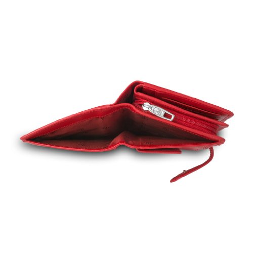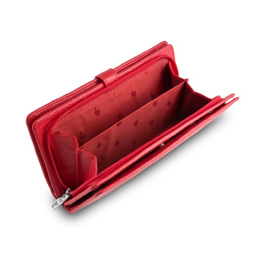 Large woman's wallet made in soft genuine calfskin leather. Adjustable closure by double metal button depending on the thickness of the wallet. Double coin purse pocket, central pocket with bellows and zip closure, inner pocket with flap. High capacity refined multi pockets wallet. 0 |