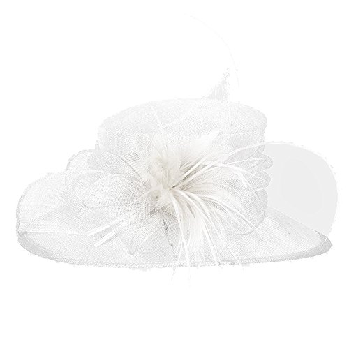 Product Description? Color : White ? Theme : Feather, Flower Leaf ? Crown Circumference : 23" ? Crown Height : 4.5" ? Brim Width : 4.5" ? Material : 100% Sinamay ? Feather Leaf Centered Medium Side Brim Sinamay Hat0