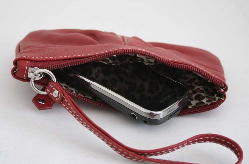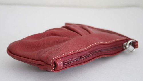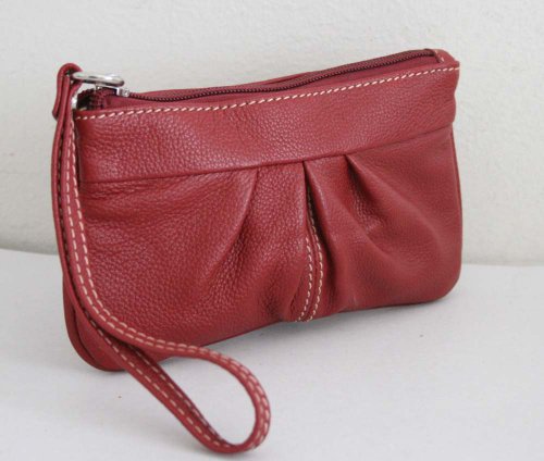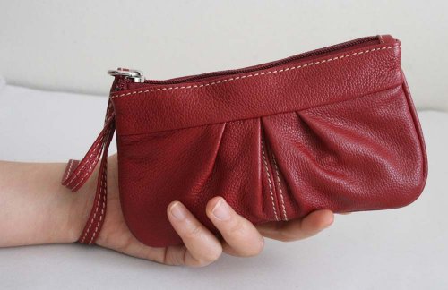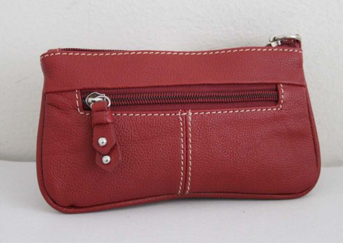 -. Feature : Top Zipper main compartment / Exterior back zipper pocket / Genuine Leather, contrast stitches, silver hardware, fully lining / Attached 6" leather wrist strap / Color : RED. All Sales are Final.
