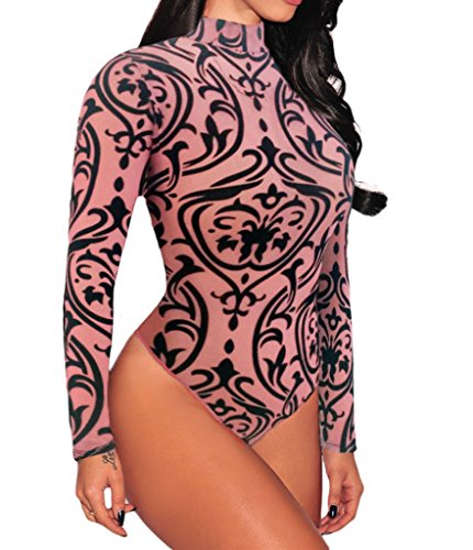 -. Title : FIYOTE Women Sheer Mesh Print Jumpsuit Long Sleeves Bodysuit