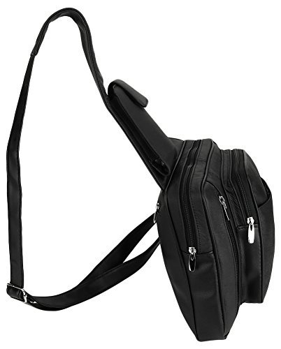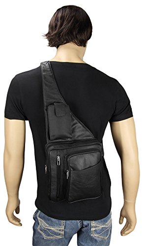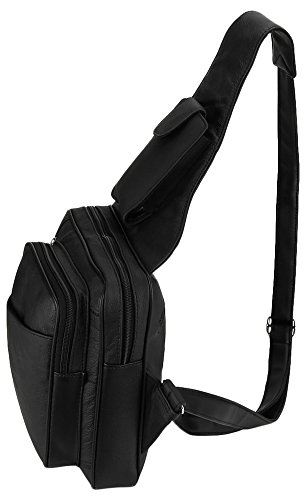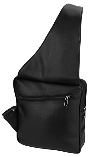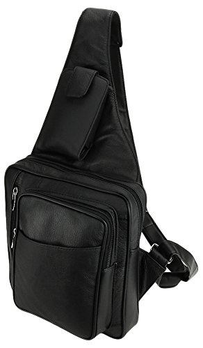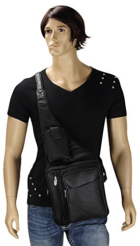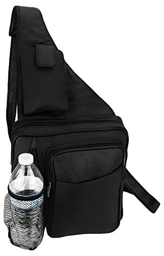 -. Feature : INCLUDED: Key ring carabiner (color varies). / Material: 100% soft quality cowhide leather; 5 zippered pockets: 1 front (8L x 6W x 1.5D) with organizer (5 card slots, 1 open pocket) , 1 zippered front with pop out mesh bottle holder (7.5 x 7.5), 1 main (8L x 8W x 2D), 1 zippered P.R.Ivacy pocket (5 x 6), 1 rear (7 x 7); 1 slant open front pocket with velcro closure (6L x 5.75W) / Stow away pop out mesh bottle holder and smart cell phone pocket (fits phones up to (5.5L x 3.75W x 1D) / Designed to fit Ipad and Ipad Mini as well as other similar tablets. Adjustable leather shoulder strap: for perfect fit / Dimensions: 10L x 9W x 4D