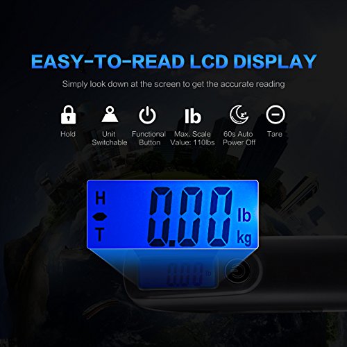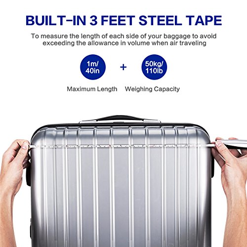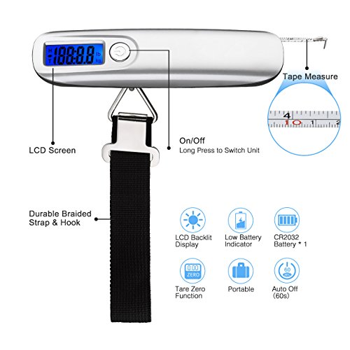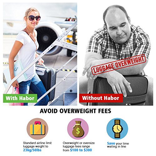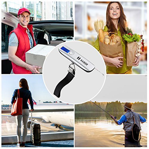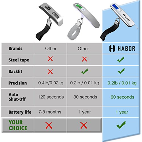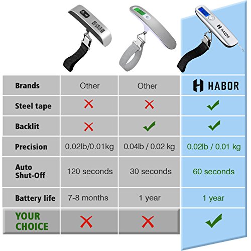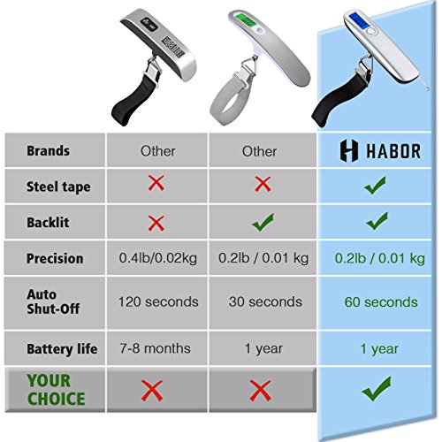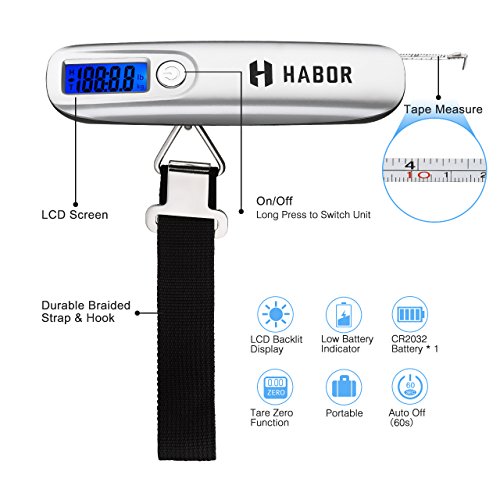 Studio : Habor Publisher : Habor Binding : Office Product Product Description Easy to Weigh, Easy to Carry! A Money Saving Tool for Travel Our luggage scale weighs only 3.5oz, which is portable and easy to store in your handbag or laptop bag. As its precision is 0.02lb(0.01kg), the measuring error will be very slight. So you can avoid exceeding the allowance in weight and volume when air traveling.(110lb/50 kg with graduation 0.02 lb/0.01 kg). Ergonomic Pressure Dispersing Design Not like other scale that you have to take immense strength to lift the scale up to your sight. With blue backlit, you can simply lift the luggage up right and look down to read the accurate value, which takes you less strength. And the scale is wide enough to grip with all the fingers to disperse the pressure, bringing a comfortable gripping experience. Not Only for Weighing Luggage Our digital luggage scale comes with a durable braided strap and a high-duty metal hook. It is convenient to lift most objects and scale something when there is nowhere to hook on. With 2-in-1 digital luggage scale, you can scale the weight of your luggage and measure the length of each side of your baggage. Durable to Weigh Auto shut down after 1 minute when there is no operation and low power consumption for power saving. Lifetime will be about 1 year and even more(Battery replaceable). It can weigh about 1000 times. Note Please hold the digital scale upright while weighing to avoid weight error. Specification Precision: 0.02lb / 0.01kg Max. Capacity: 110lb / 50kg Steel Tape Length: 3ft / 1m Auto Power Off: 1min Weight: 3.5oz / 100g Warranty Every product provides a 45-day money back guarantee and 18-month warranty. 0