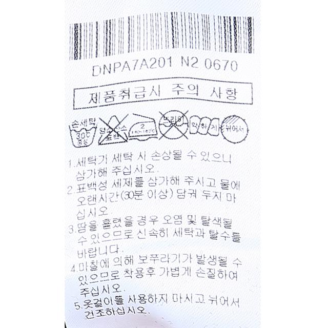 세탁방법 및 취급시 주의사항 1.세탁기 세탁 시 손상될 수 있으니 삼가해 주십시오. 2.표백성 세제를 삼가해 주시고 물에 오랜시간 (30분 이상) 담궈 두지 마십시오. 3.땀을 흘렸을 경우 오염 및 탈색될 수 있으므로 신속히 세탁과 탈수를 바랍니다.